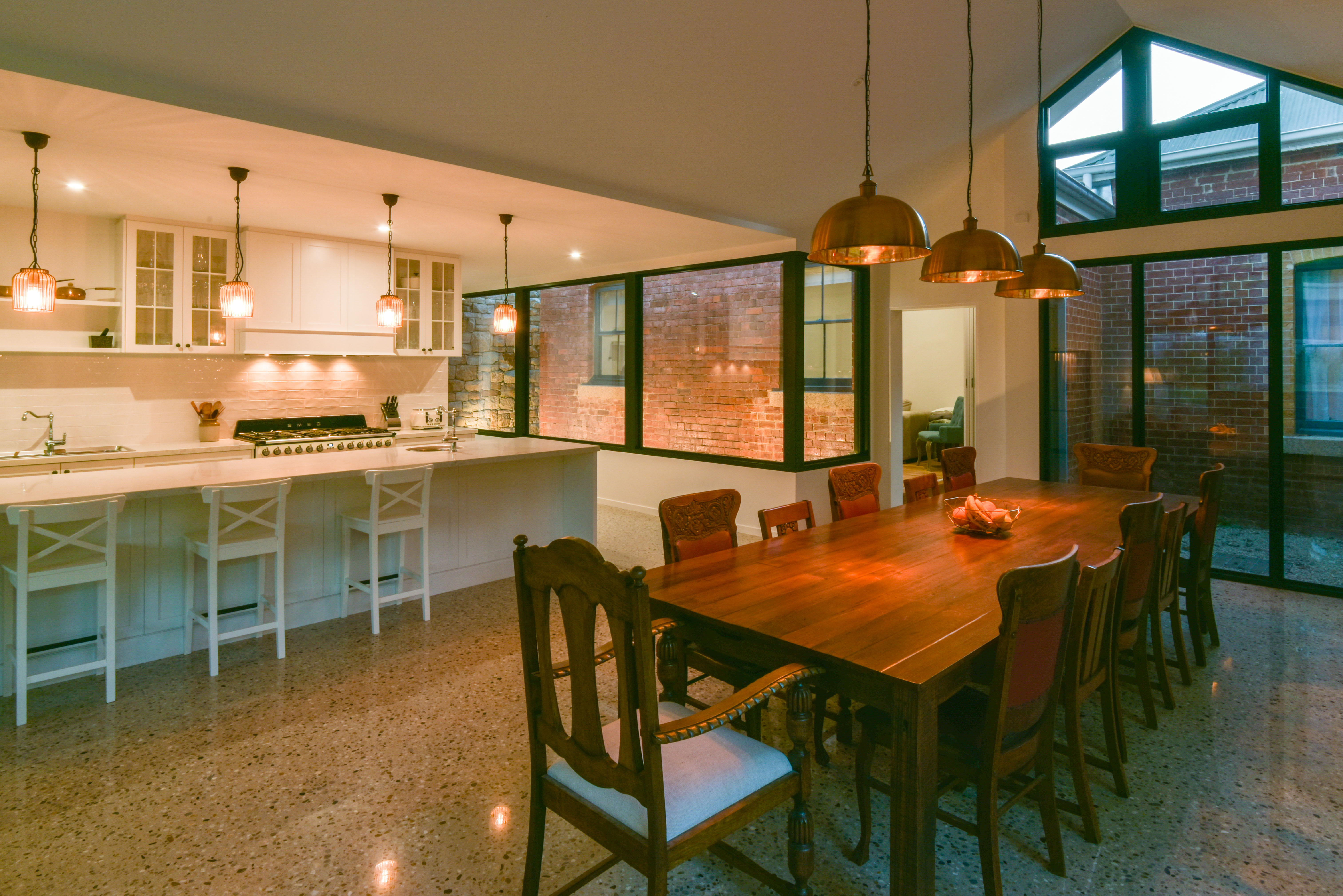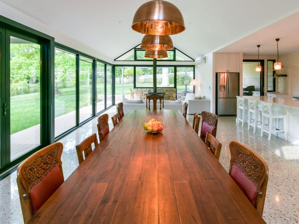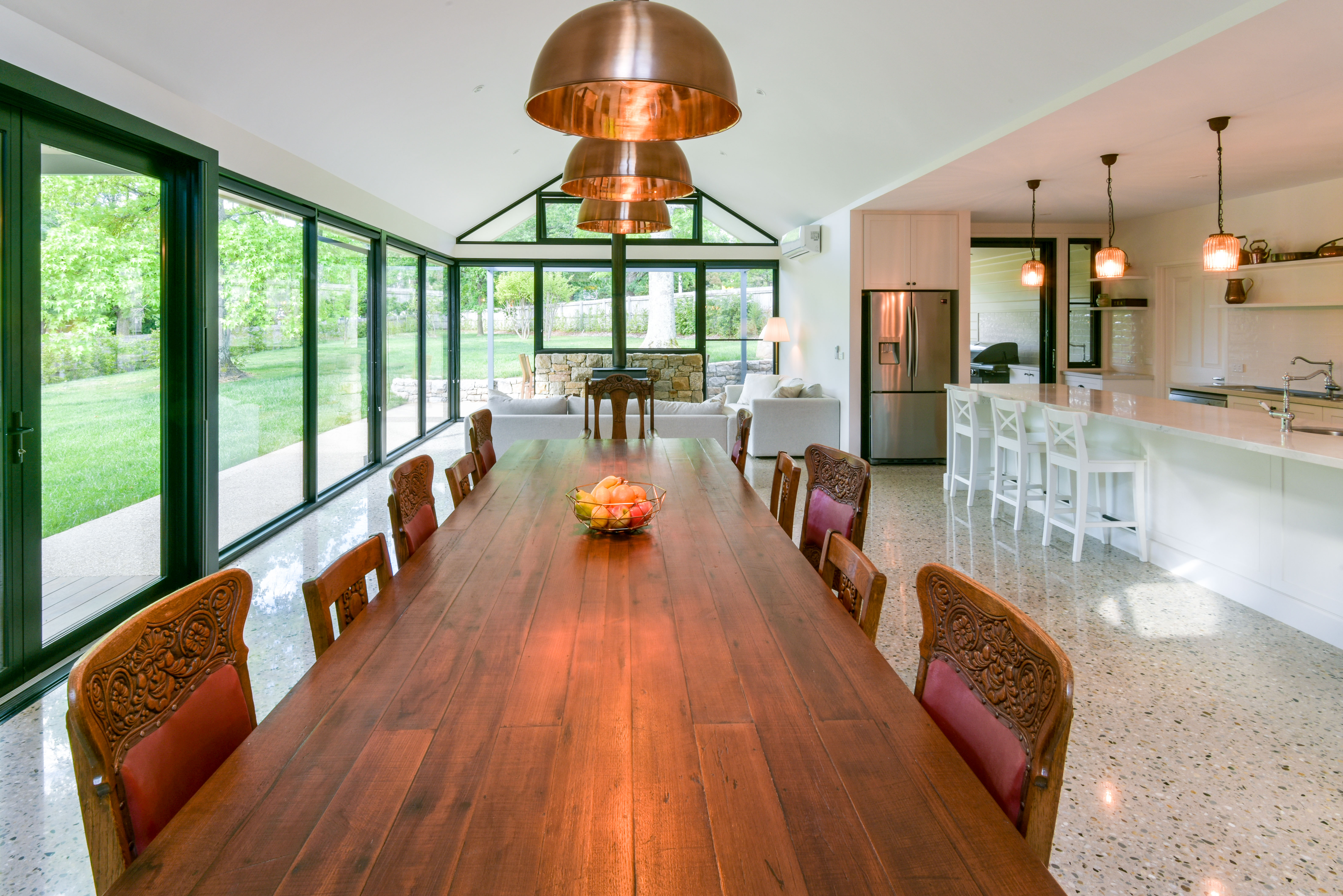 The magnificent 12 seat dining table is one of the central parts of the house. The copper overhead lights, along with the nearby fireplaces, provides the perfect spot for hours of dining.