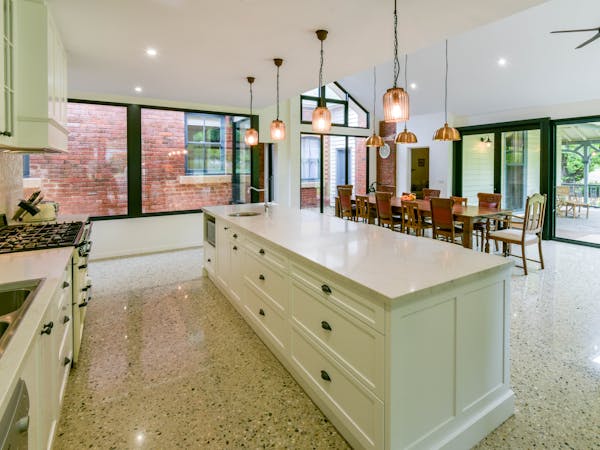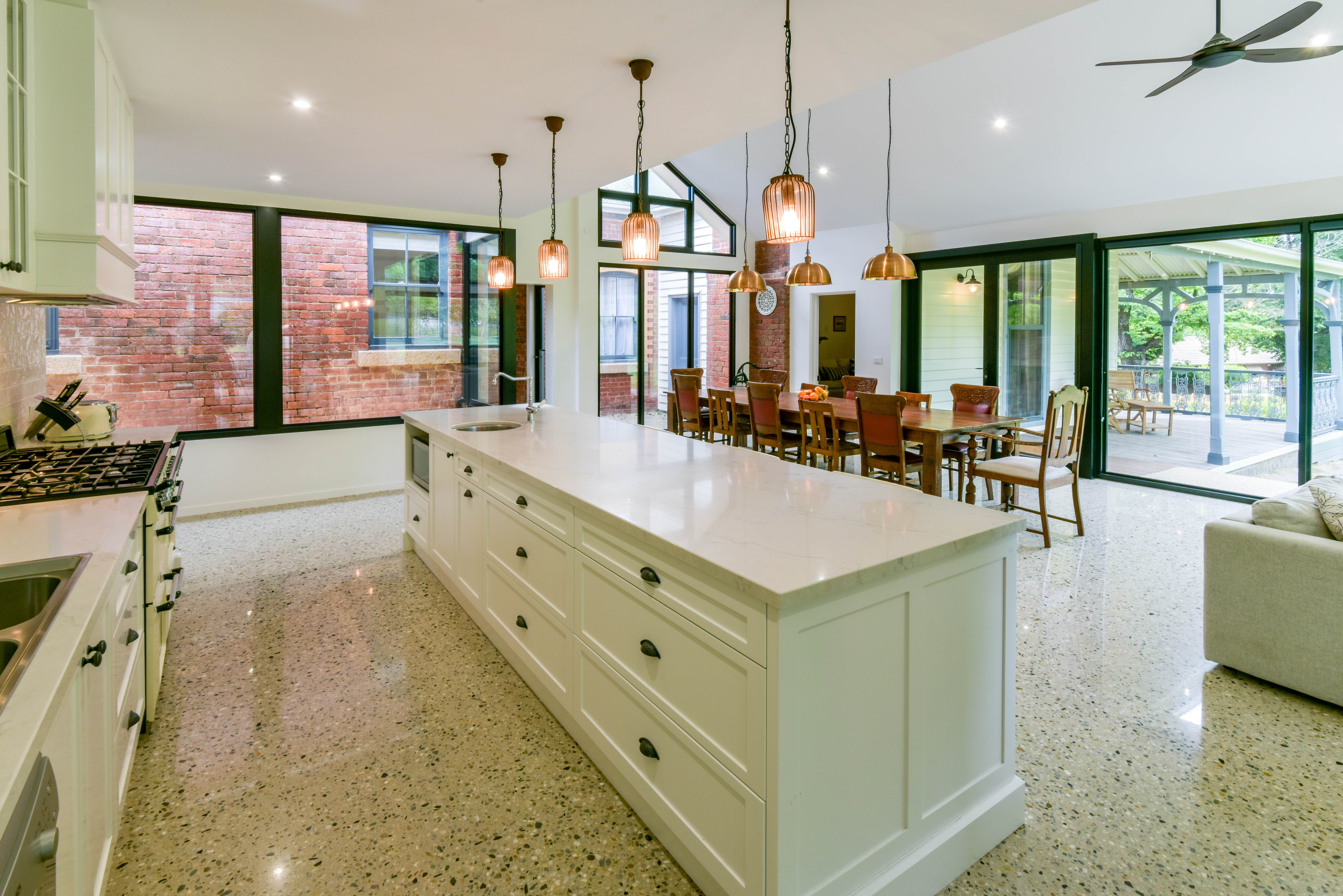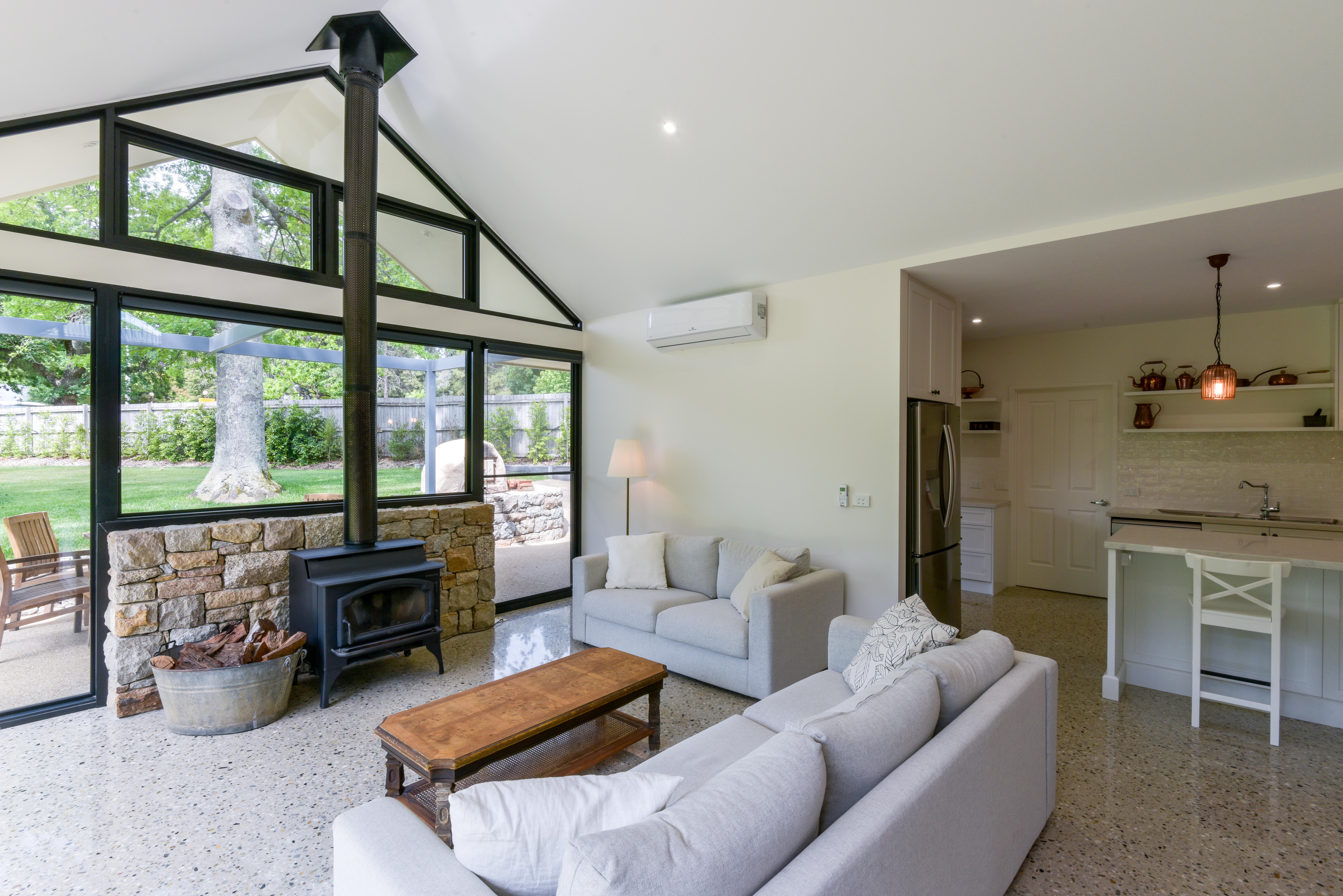 The north corner of the new building catches plenty of sunlight & overlooks the vast lawn garden. Huge wood burner (can take a 2 foot log) provides plenty of warmth & ambiance. Heated polished concrete floor and air-conditioning throughout the new extension.