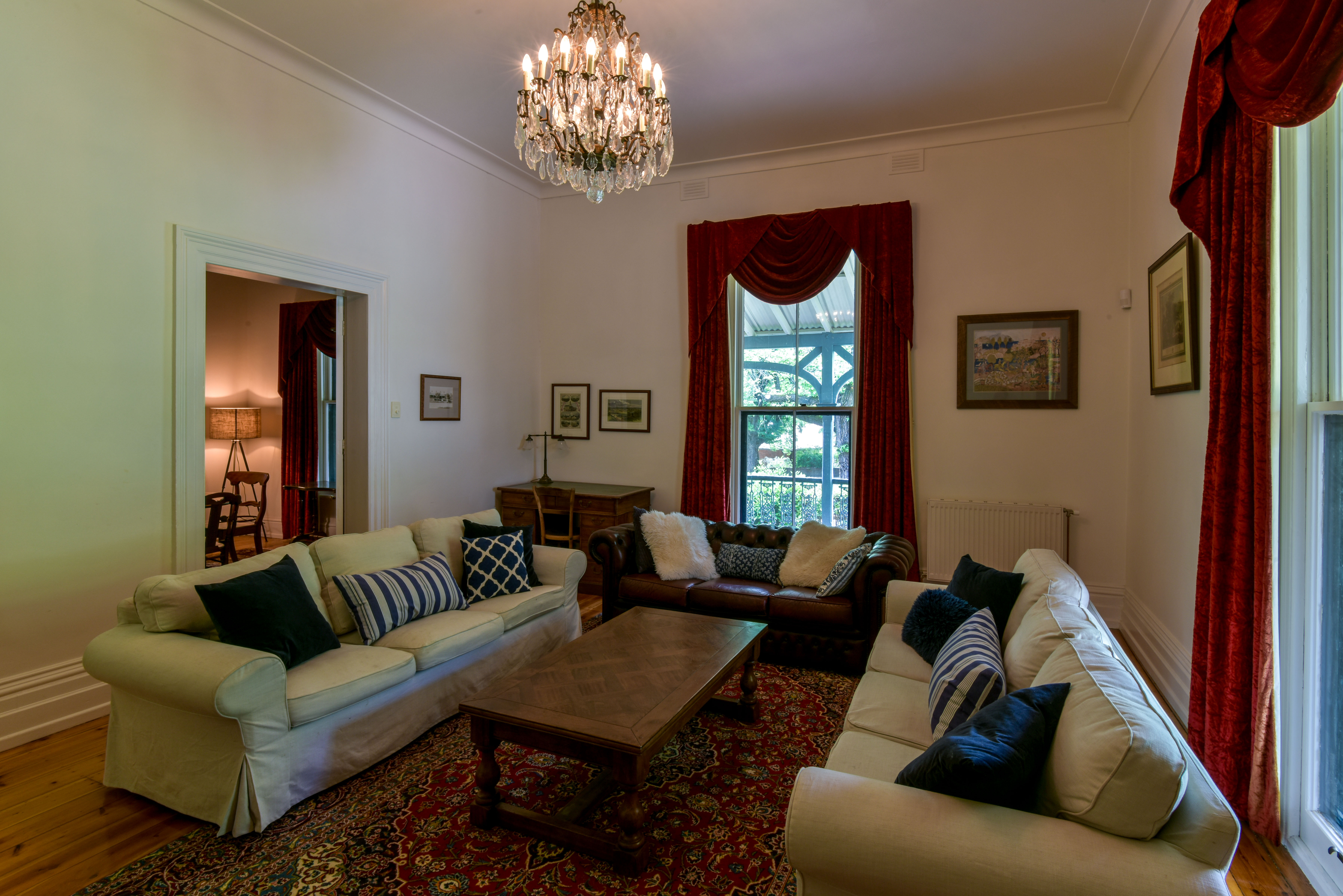 Relax in this large 1890's grand room, under a huge chandelier on one of the 3 large couches by the open fireplace. Features 10-foot double hung sash windows and crazy old red velvet curtains.