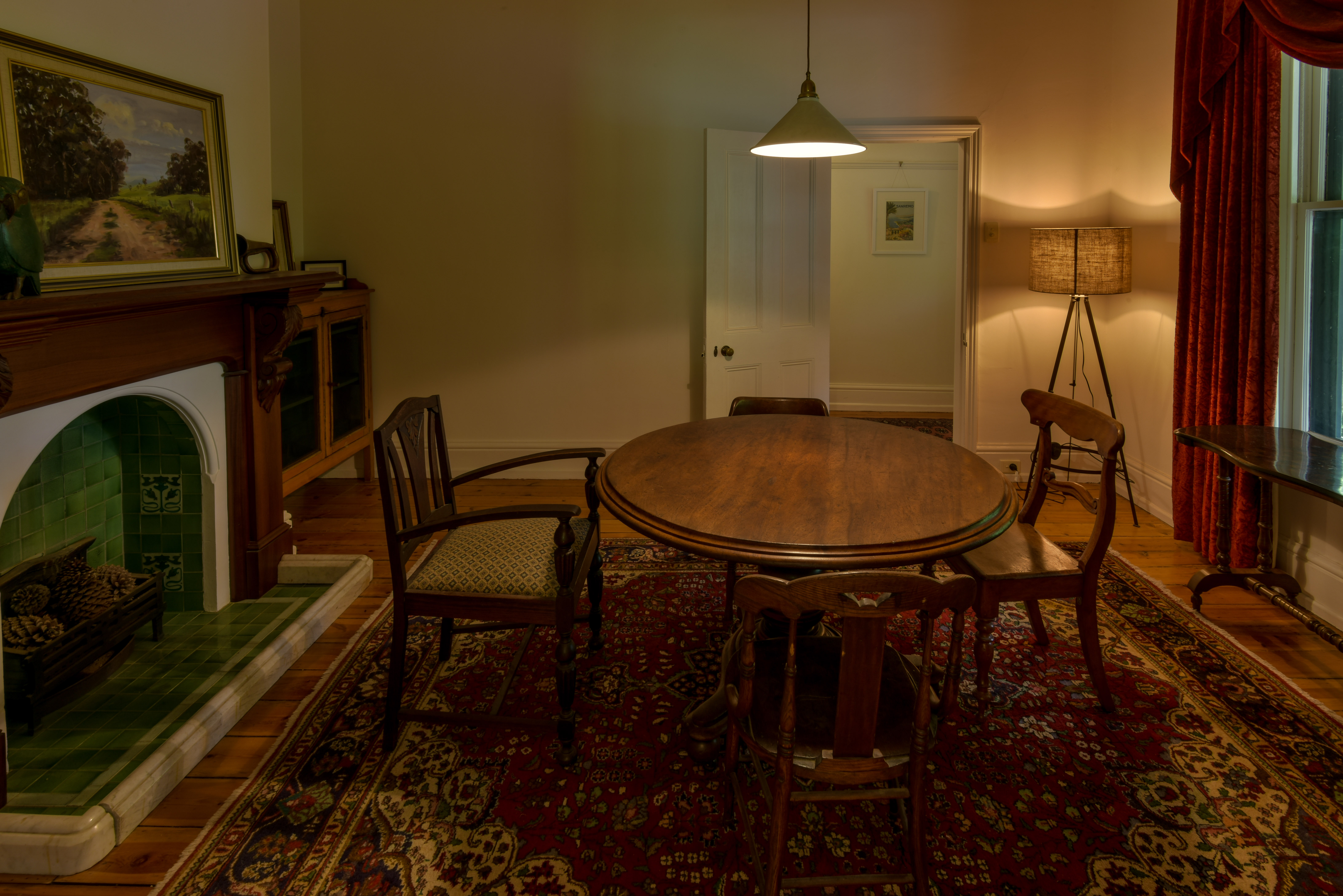 The original 1875 sitting/dining room that has been repurposed into a games parlour. A traditional 6 seat round old oak table with counterweight light overhead makes the perfect setting for any card or board game